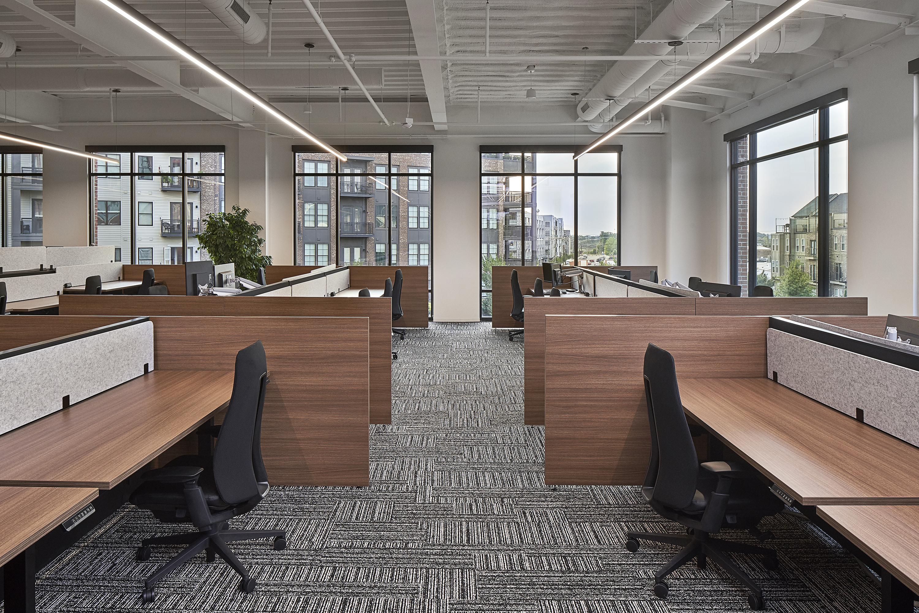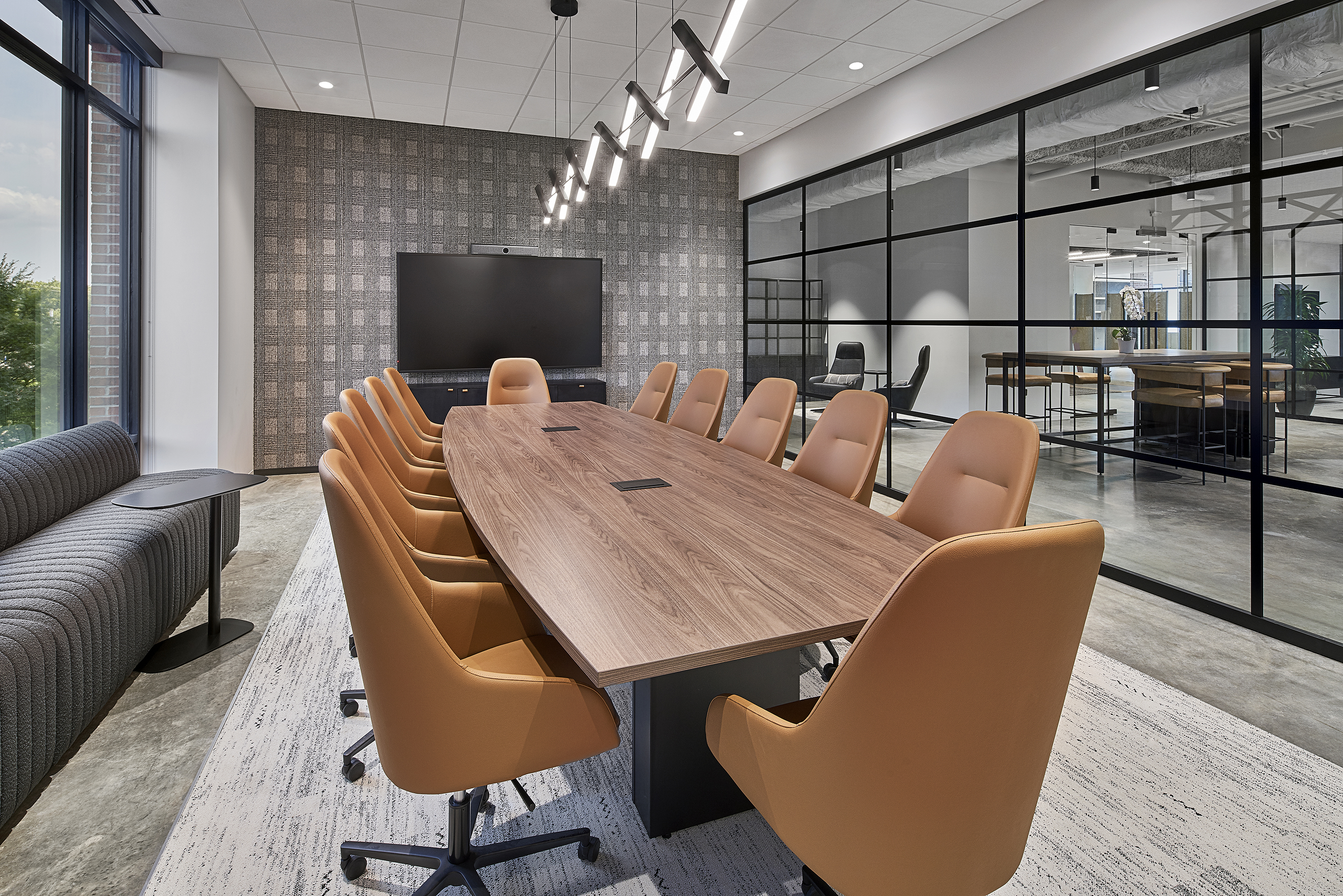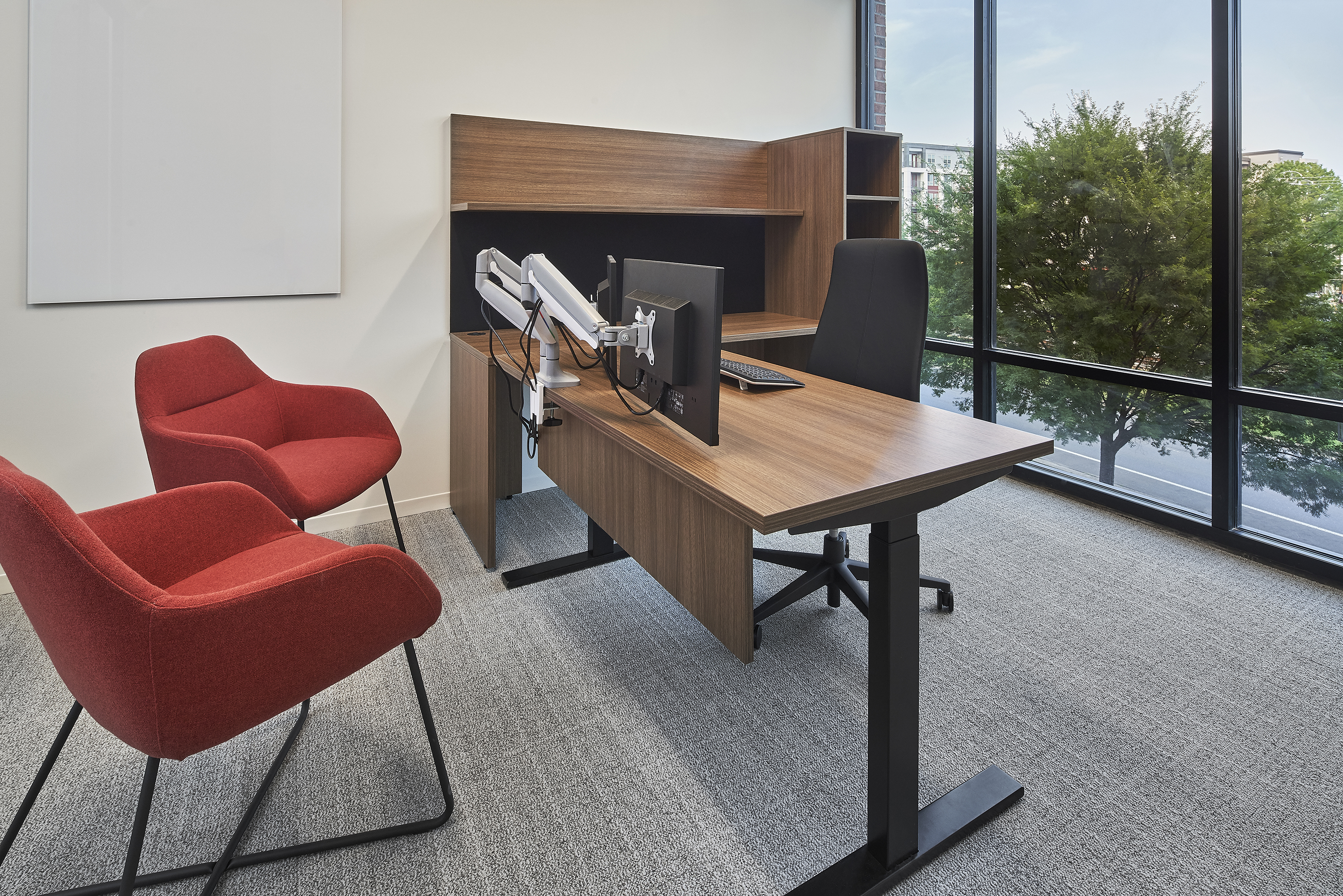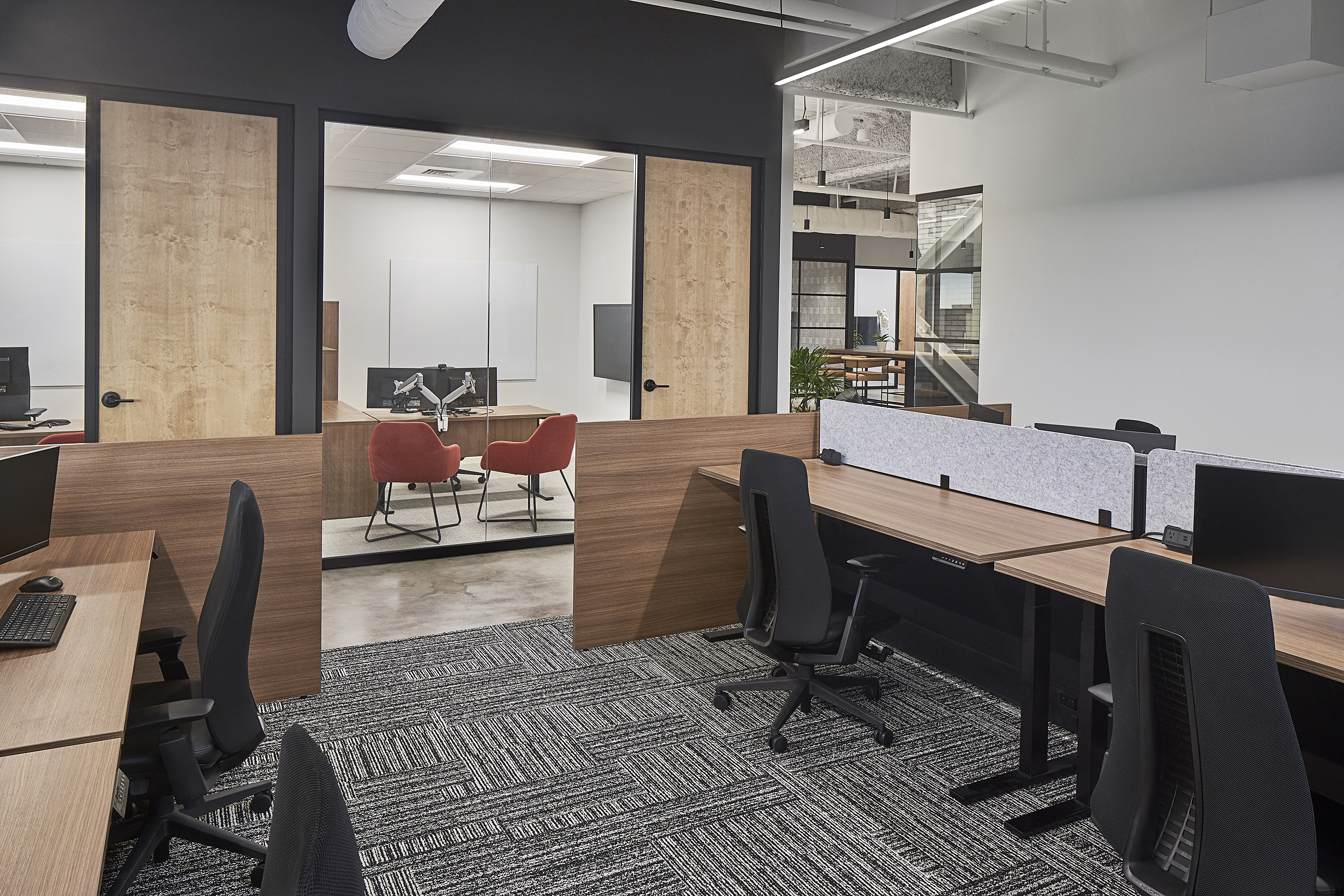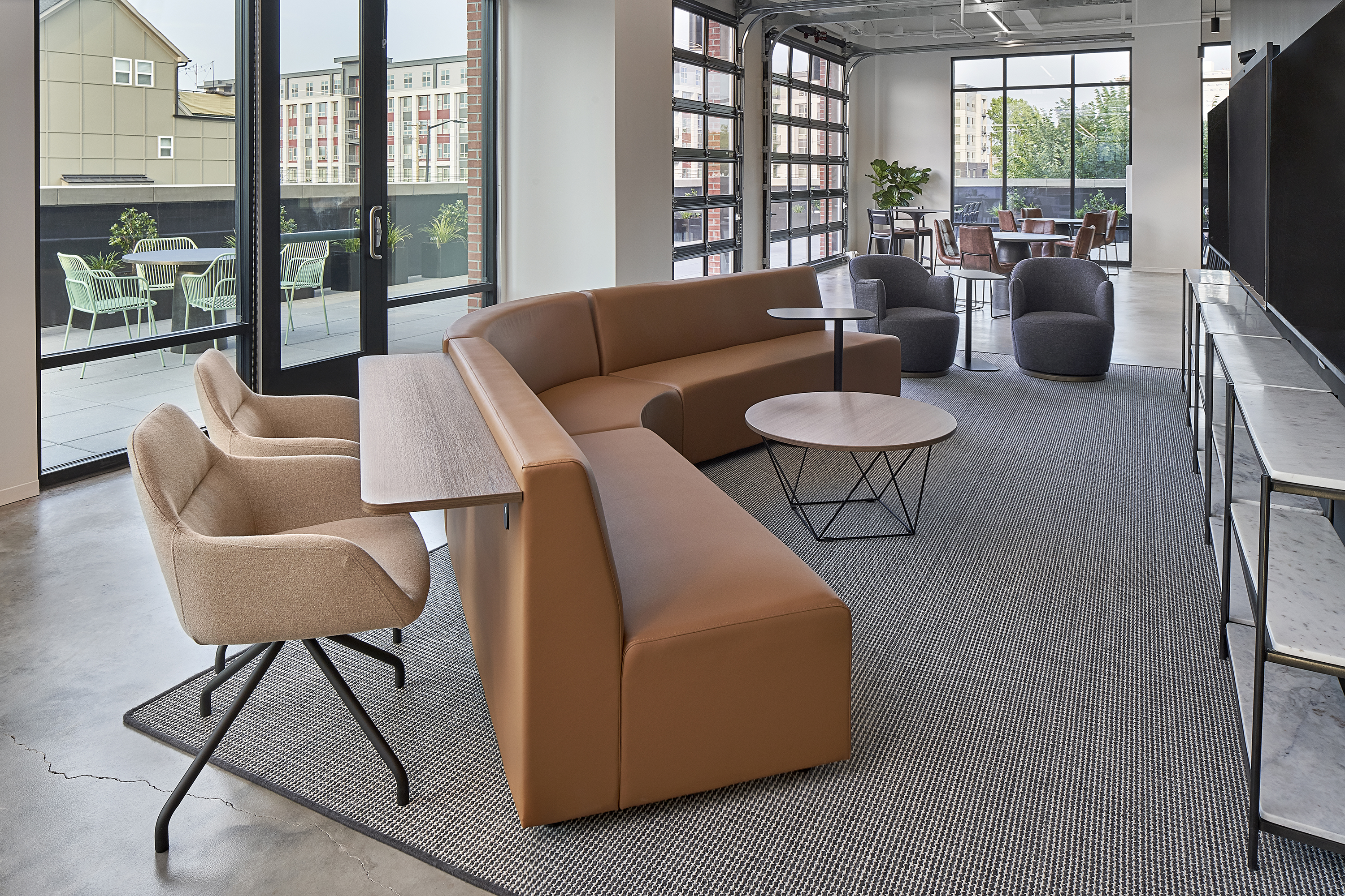 AIS proposed Matrix panel system. The adaptability and durability coupled with the warmth of laminate and low panel options, helped give users access to daylight and to team members. Plus, Matrix high capacity power and data capabiilties supported the high level of technology required by Gambling.com. Calibrate Conference tables and Prisma tables were selected to anchor meeting spaces with their clean design and affordability. The Hakr Lounge with Ledge paired with Juggle seating created welcoming areas for collaboration and comfort .