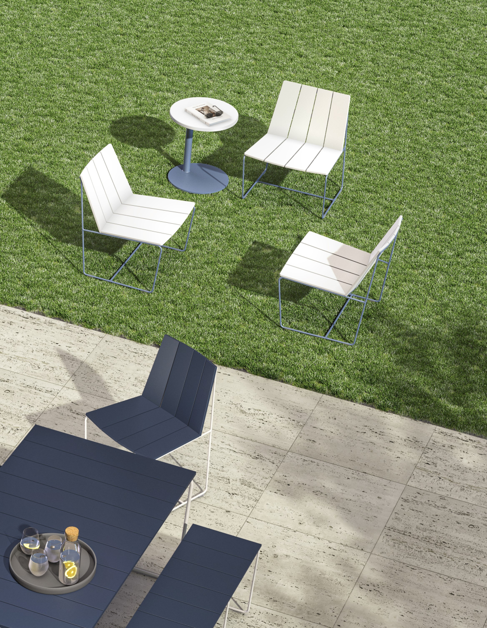 The Seaboard series offers a full line of dining tables with seating, plus lounge and ottoman sets, supporting diverse ways to dine, meet, and relax. High-Density Polyethylene (HDPE) slats provide the warm look and feel of wood without the maintenance, while a sleek wire frame adds a modern touch.